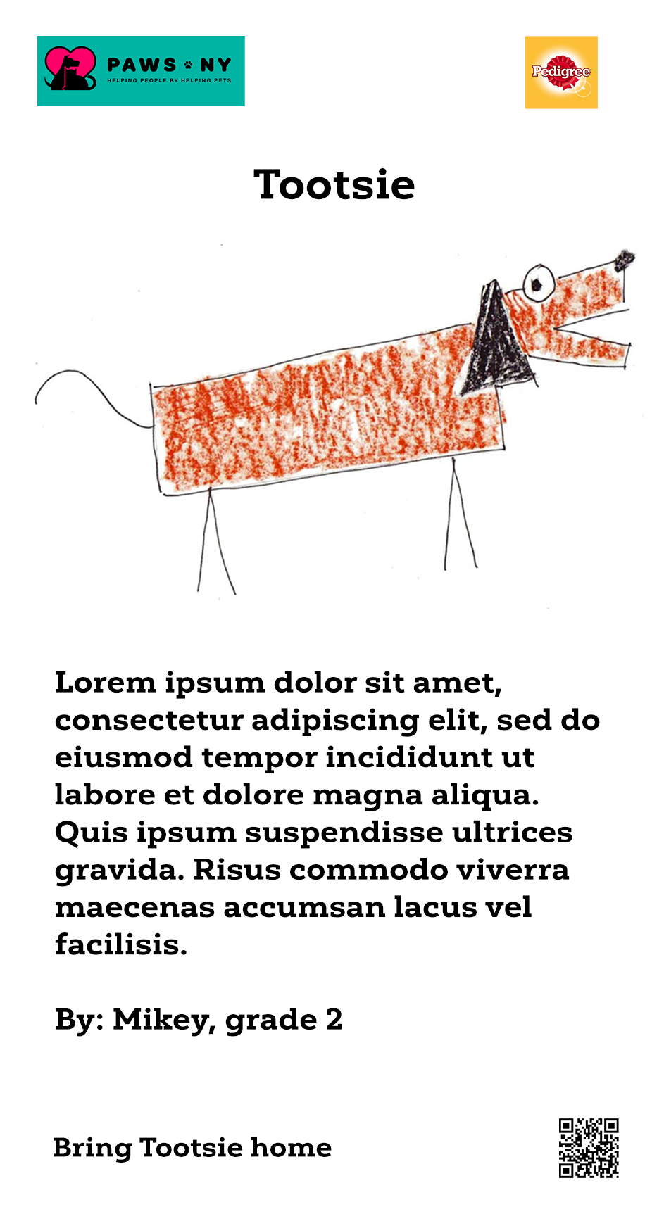 Pedigree will partner with local elementary schools and shelters to help young writers craft persuasive essays encouraging community members to adopt dogs. Through writing and art, students will advocate for shelter pets, learning the power of persuasion along the way. Their essays and drawings will be displayed in and around shelters to inspire more adoptions.